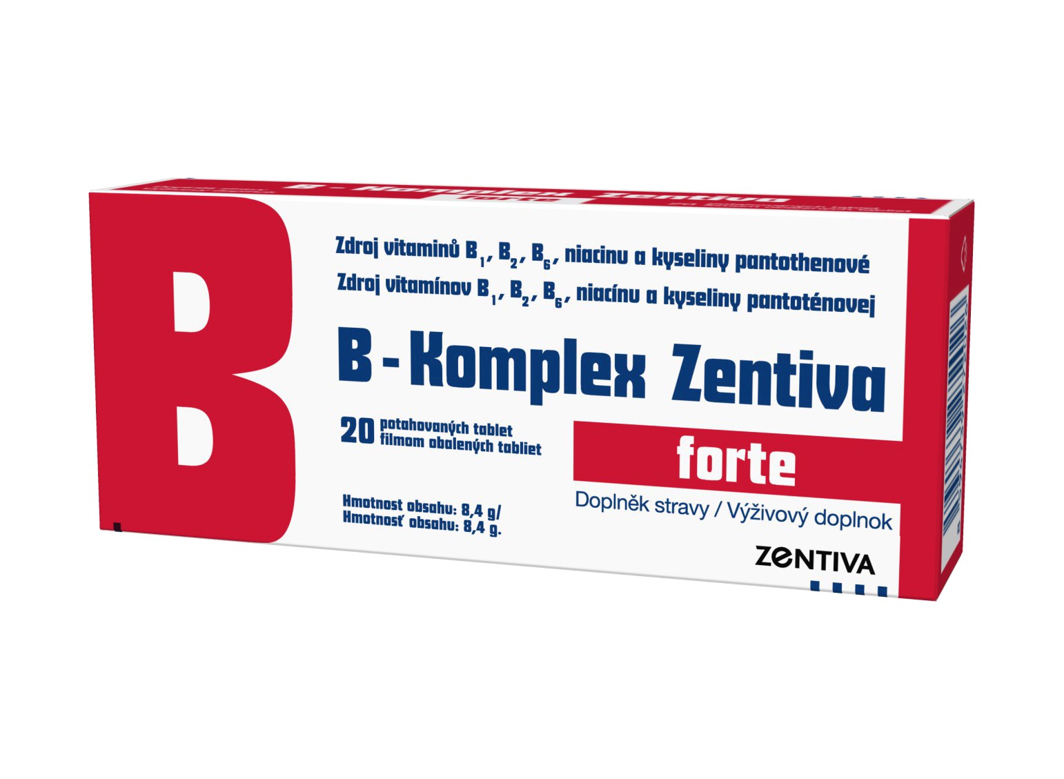 - Jedna tableta obsahuje (*RHP): Vitamín B1 11,2 mg (1 018 %), Vitamín B2 15 mg (1 071 %), Vitamín B6 8,2 mg (586 %), Niacín 50 mg (313 %) a Kyselinu pantoténovú 22,3 mg (372 %).