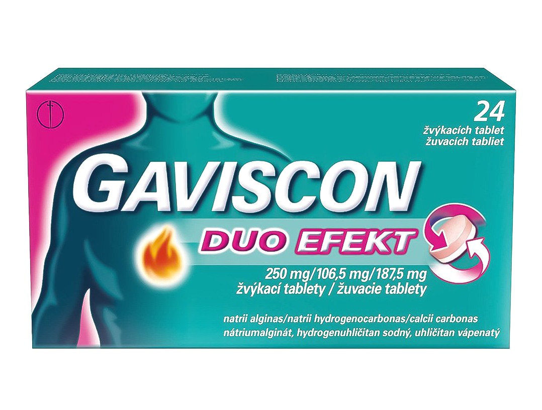 Gaviscon Duo Efekt Žuvacie tablety sú inovatívny liek obsahujúci kombináciu dvoch antacíd (uhličitan vápenatý, hydrogenuhličitan sodný) a alginátu, ktorý efektívne pôsobí na príznaky spojené so žalúdočnou kyselinou.